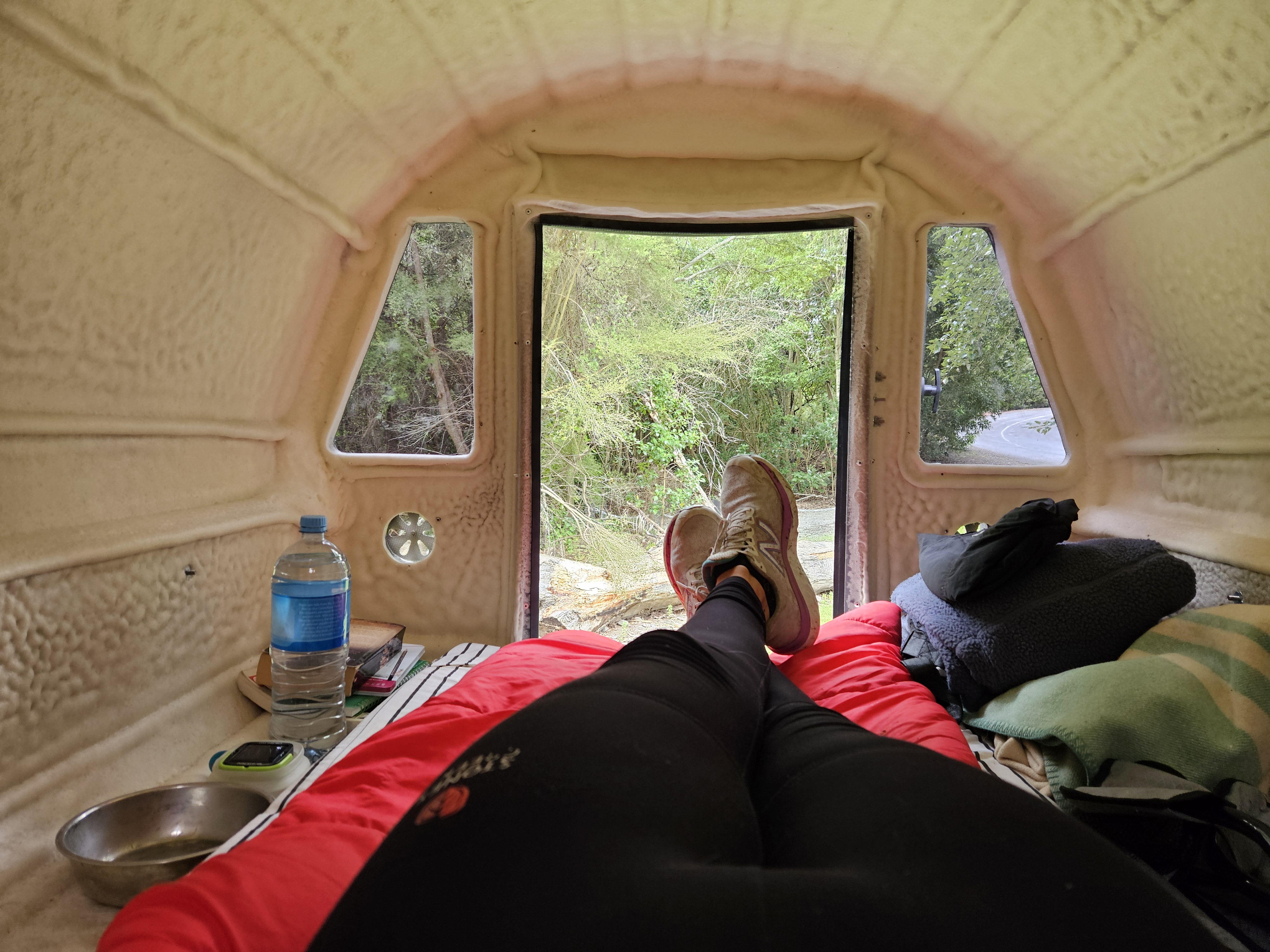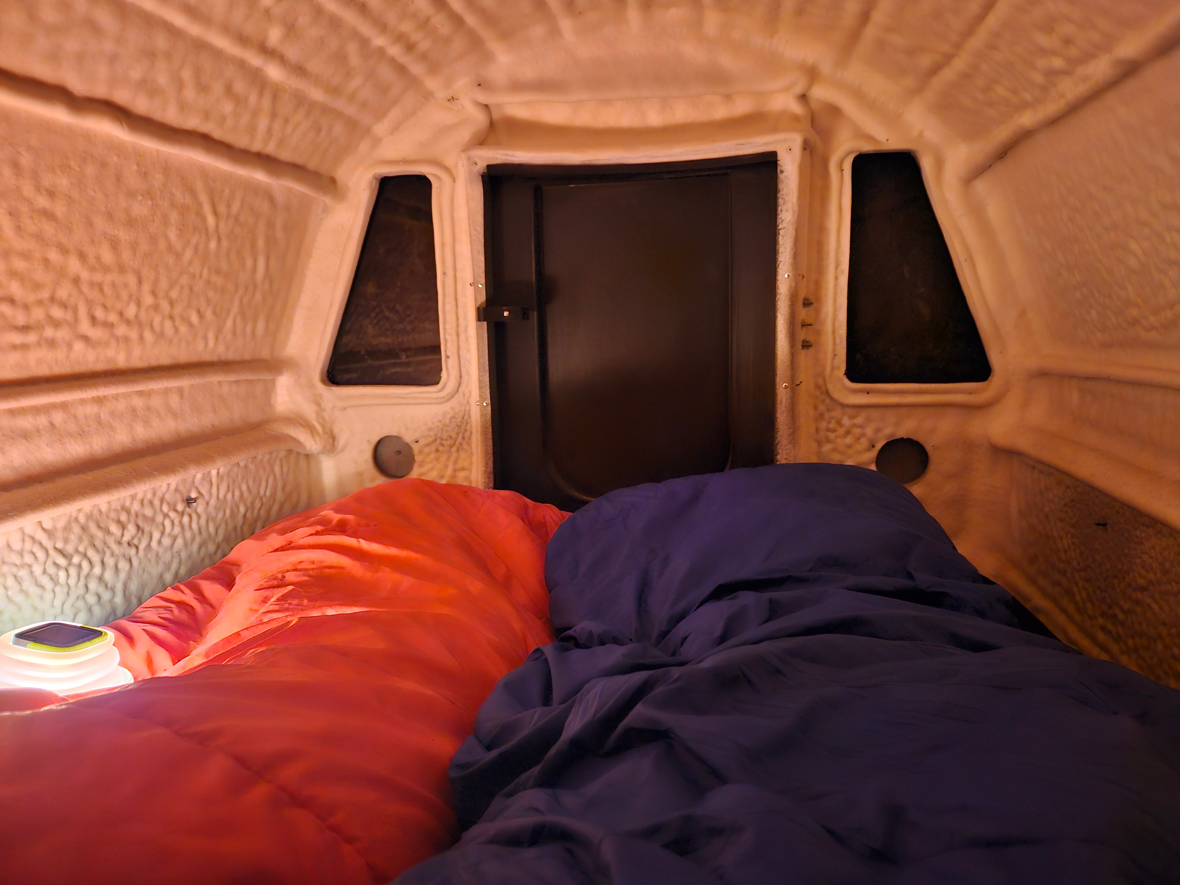 The T-shaped pod interior, with indented sides to fit over the ute wheel hubs, features built-in side seating by day that can be converted to a sleeping platform come nightfall to cosily sleep 1 or 2 people (12-15mm ply works well). Or 1 person can sleep in the 60cm wide footwell area in an emergency! The beauty of adding the plywood platform across the footwell is that it offers fantastic additional storage space underneath for your general gear, food, wet boots etc.