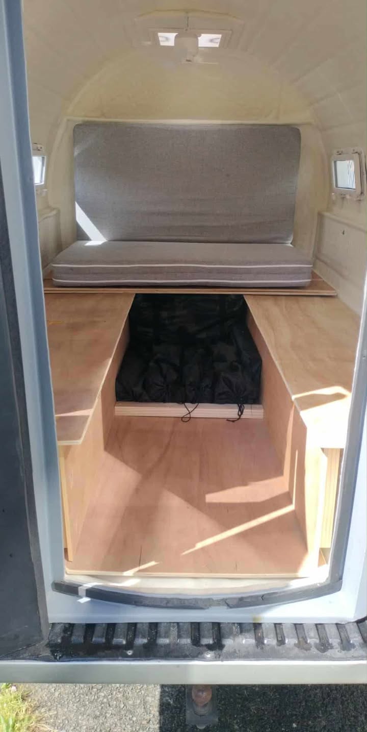 The interior features side seating by day that can be converted to a large sleeping platform come nightfall. (12mm ply works well)